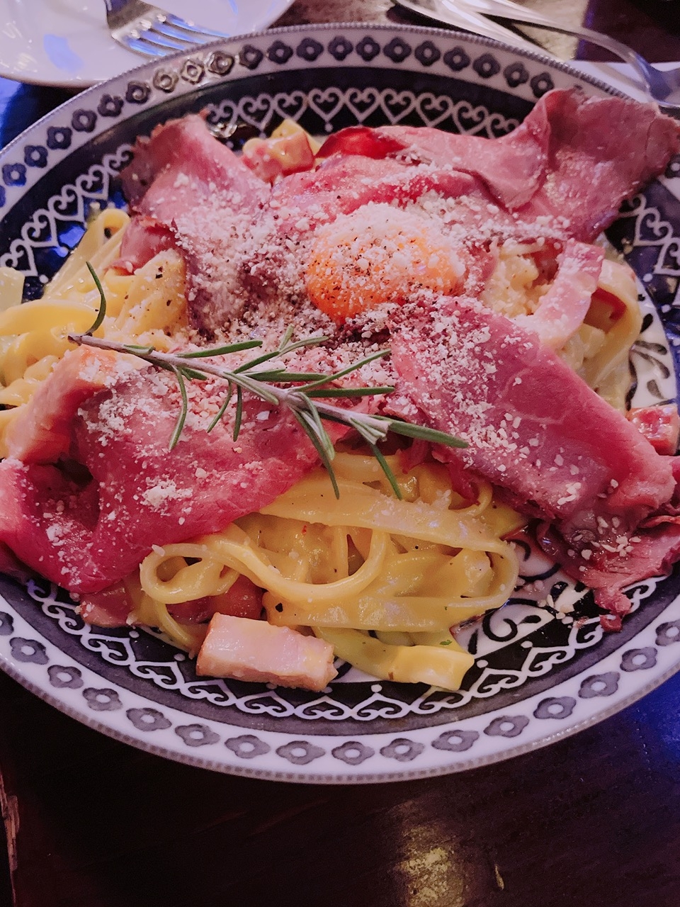 そもそもお店の雰囲気が英国風なのでとてもおしゃれも 加えてBGM映像がフェスバ カウンターに注文しに行くんだけど、ドリンクは作ってる流れをそこで見ながら待つから楽しい! フードは各席で待ってて時間はかかるけど美味しさが半端じゃない! 特にカルボナーラは超おすすめ! ビーフがアーサーULTを連想させる十字になってたり、メニューそれぞれにこだわりがあるのが伝わってくる!