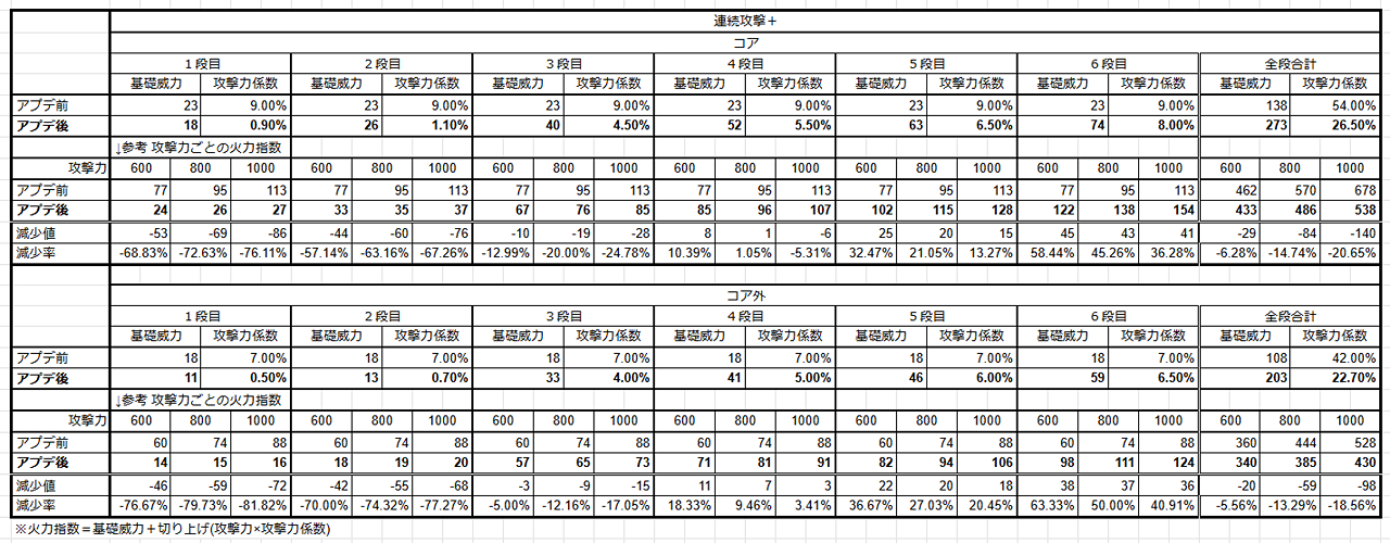連続攻撃がダメージ比率だけじゃなくてちゃんと火力も下方修正されててビビった。そんなこと言ってませんでしたよね!? 基礎威力が底上げされた代わりに攻撃力係数ががっつり減らされたので、攻撃力が高いほど影響大