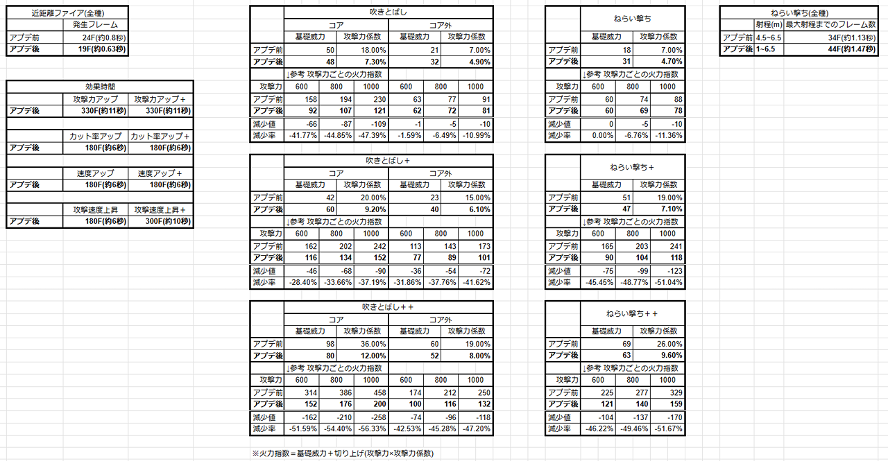 1枚目は近距離ファイア,バフ系,吹きとばし,ねらい撃ち(バフ系はアプデ前を計測してなかったので比較できてません…申し訳ない🙏)