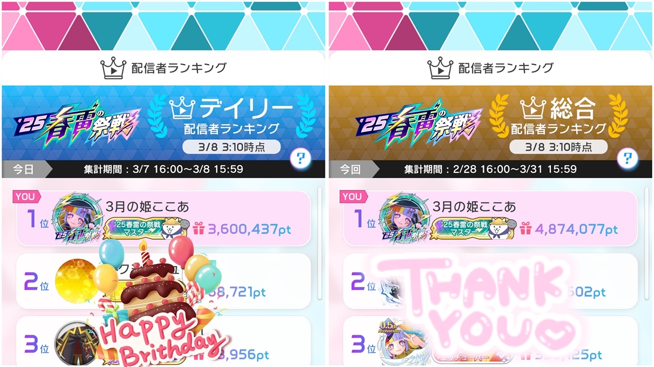 たくさんのお祝いのメッセージ、配信でのカウントダウン&デイリー歴代1位本当にありがとうございます!366万、、、姫本当に愛されてる🥹🥹