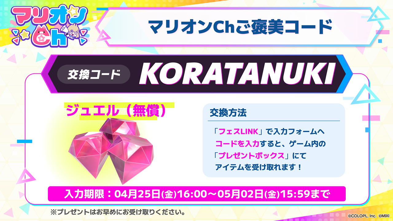 フェスリンクにいるキャプテン!! KORATANUKI を入力してない方は是非👀✨ 本日15時59分までです。 ジュエルはなんぼあってもいいですからね