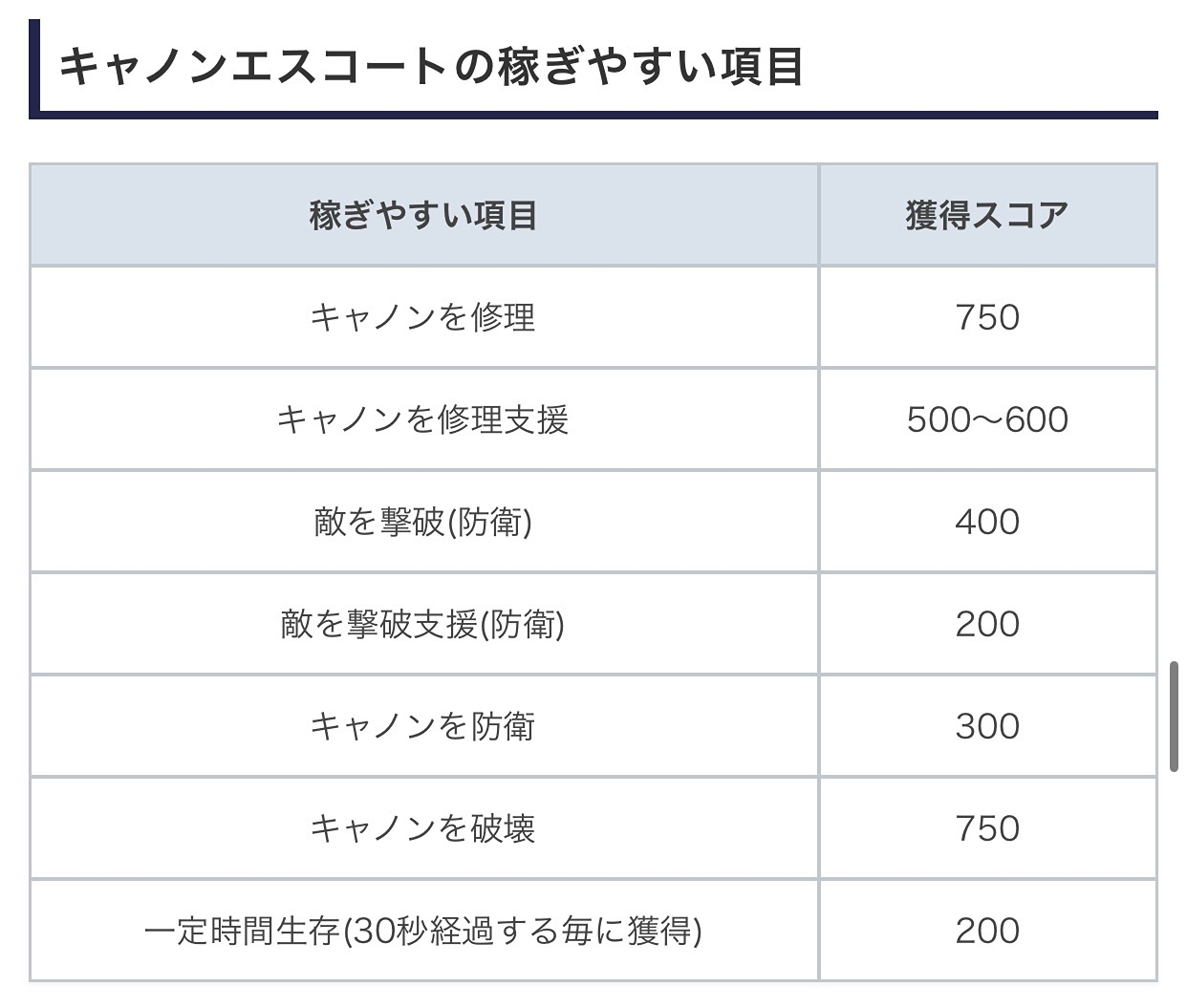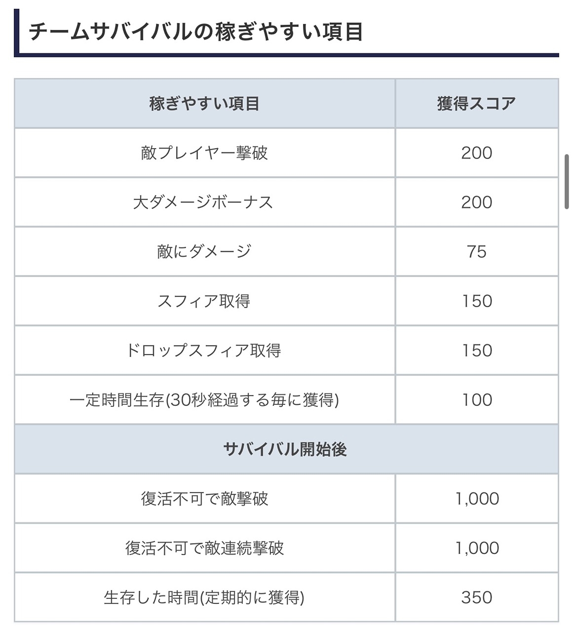 各ルール毎の獲得スコア一覧