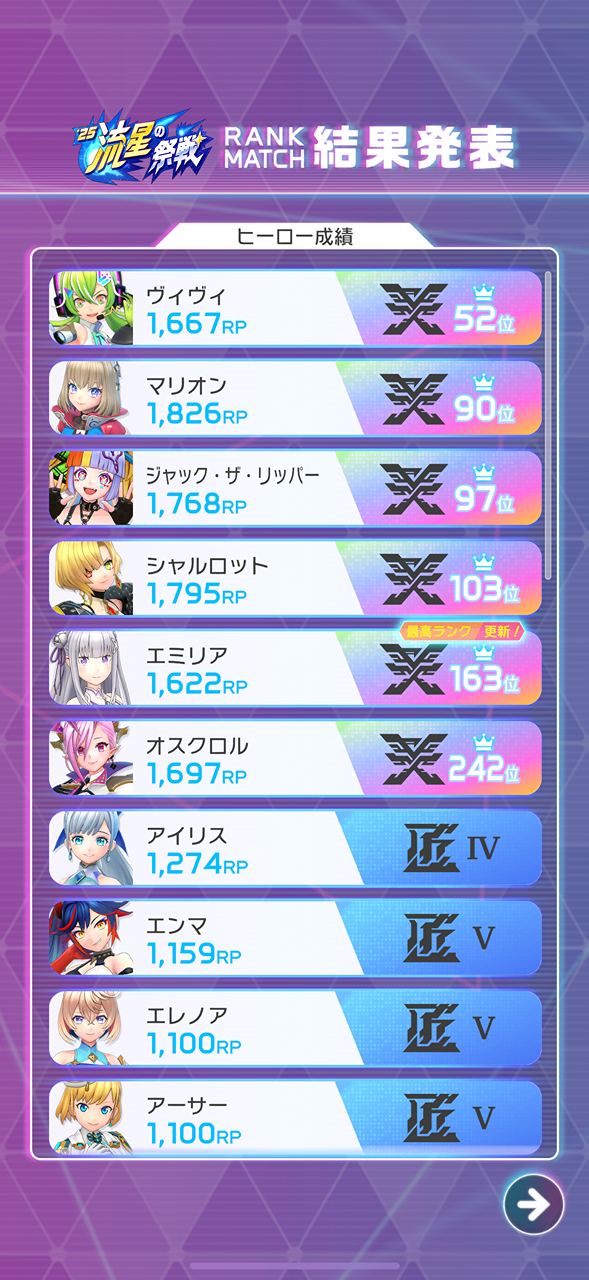 エミリアのレジェンド入りに、マリオンとシャルの最高rpを上げたシーズンでした。 今期は、リヴァィの銅ランクをあげたいけど、キューブを使いたくなくて、使いあぐねてる_(:3 」∠)_