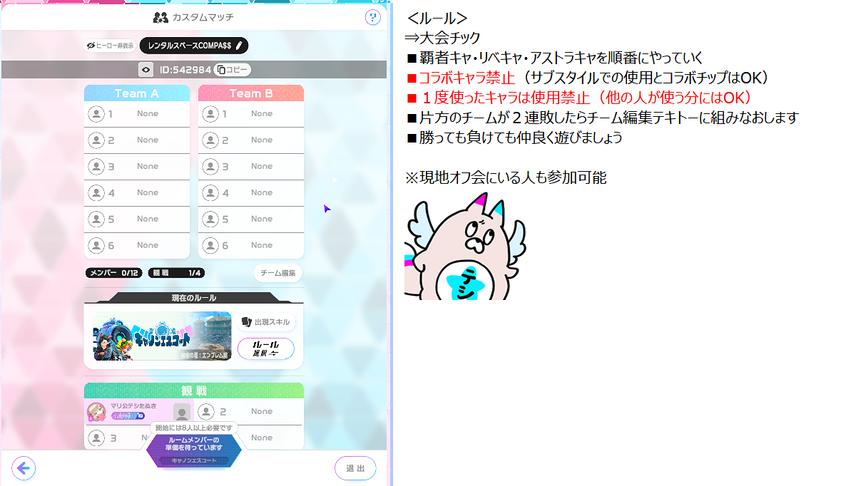 1時間ぐらい(0時ぐらいまで)やろうと思います <ルール> ⇒大会チックなルールにします ■覇者キャ・リベキャ・アストラキャを順番にやっていく ■コラボキャラ禁止(サブスタイルでの使用とコラボチップはOK) ■1度使ったキャラは使用禁止(他の人が使う分にはOK) ■片方のチームが2連敗したらチーム編集テキトーに組みなおします ■勝っても負けても仲良く遊びましょう