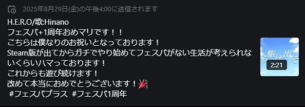 明日16時よりフェスバ+1周年お祝い動画投稿します…!