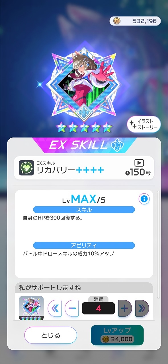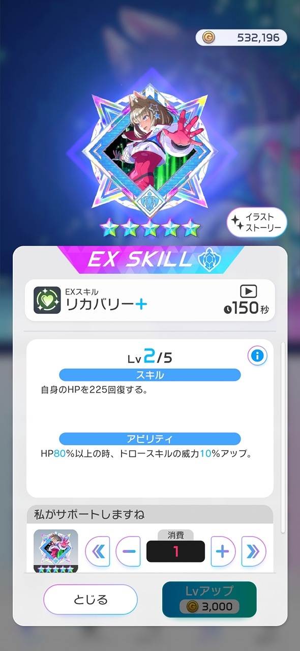 とりまEXスキルの凸仕様について軽く説明しときます。 まず1凸特典はウェアと同じくついてきますか共通で80%以上じゃないと効果が発生しないから注意、3凸にすれば30%以上、完凸だとバトル中常時発動になるよ そして凸すればEXスキルの性能が上がっていくよ1凸目と2凸目は効果量や威力アップ、3凸目、4凸目はCT短縮となるよ とりあえず完凸狙うのは厳しいけど2凸いければ良いかなって位の気力で新祭戦ガチャに挑んでみてくだせぇ