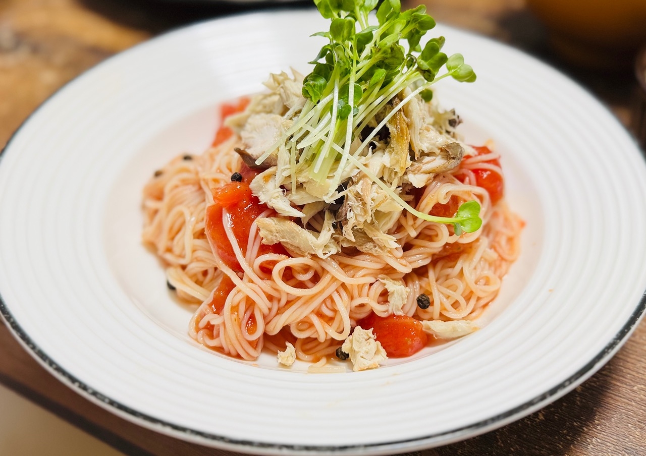 サバとトマトバジルの冷やし素麺出来上がりー(●´ω`●) 狙いの味が出来て最高に幸せ!!