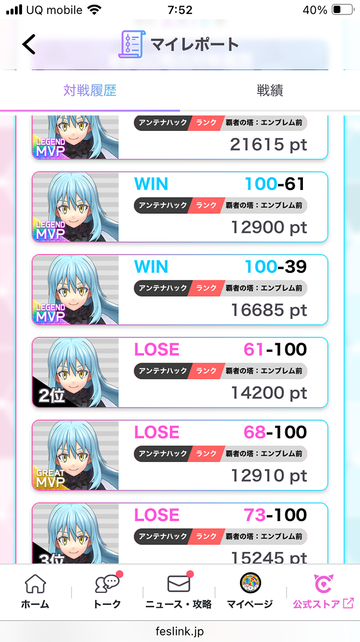 スコア稼ぎやすいリムルとは言え、全部チームMVPは頑張ったと思う 3連敗した時に愚痴ったのは反省
